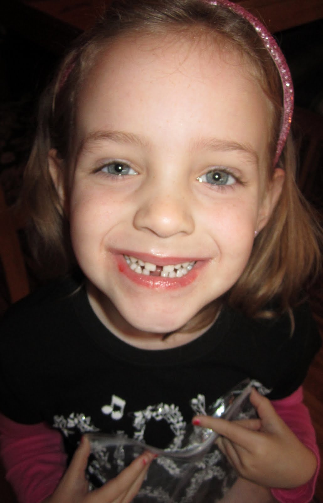 I think she looks cute without the wiggly tooth on. Oh, please stay that way little lady! Your momma's very lucky to have an adorable and sweet girl like you! =)